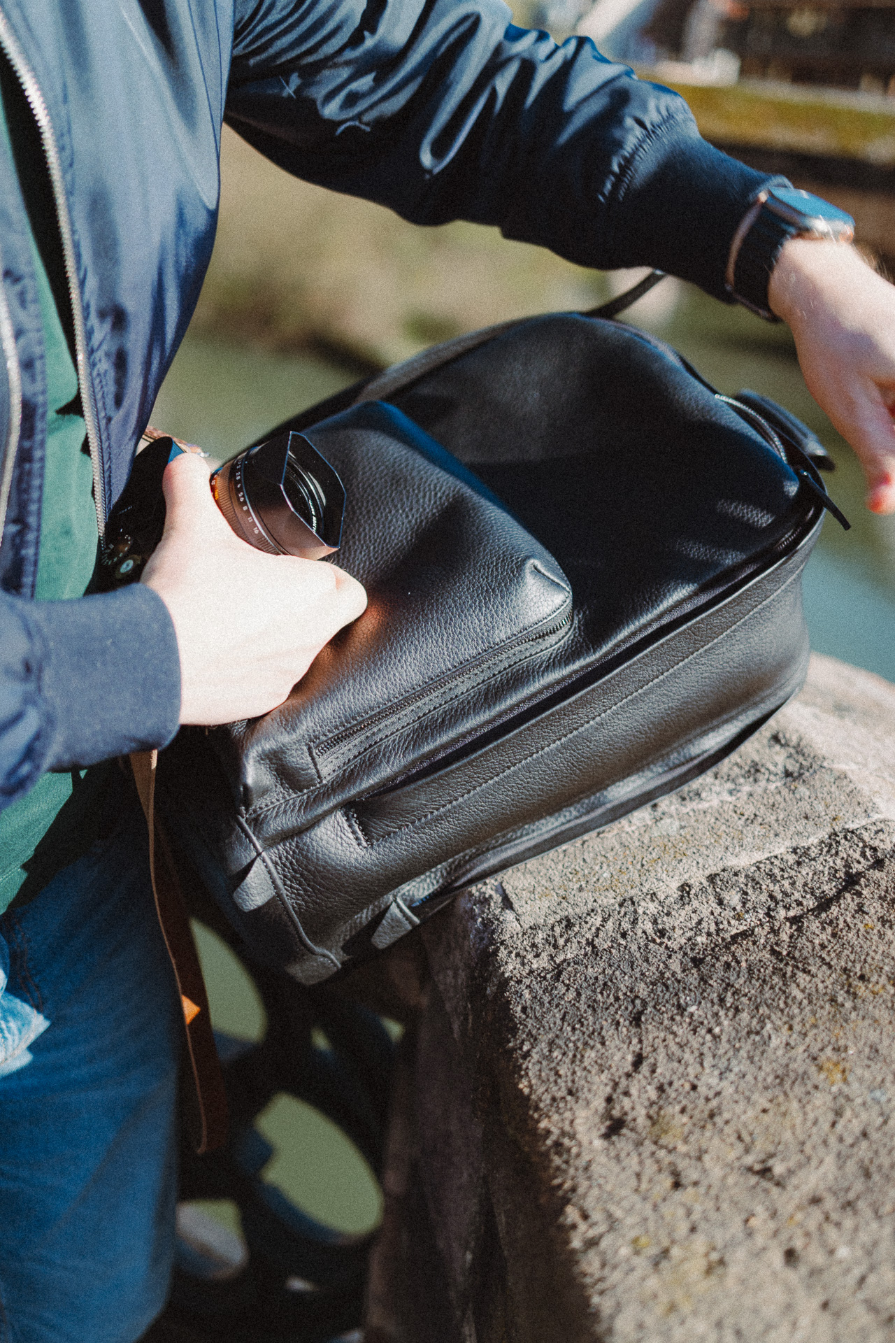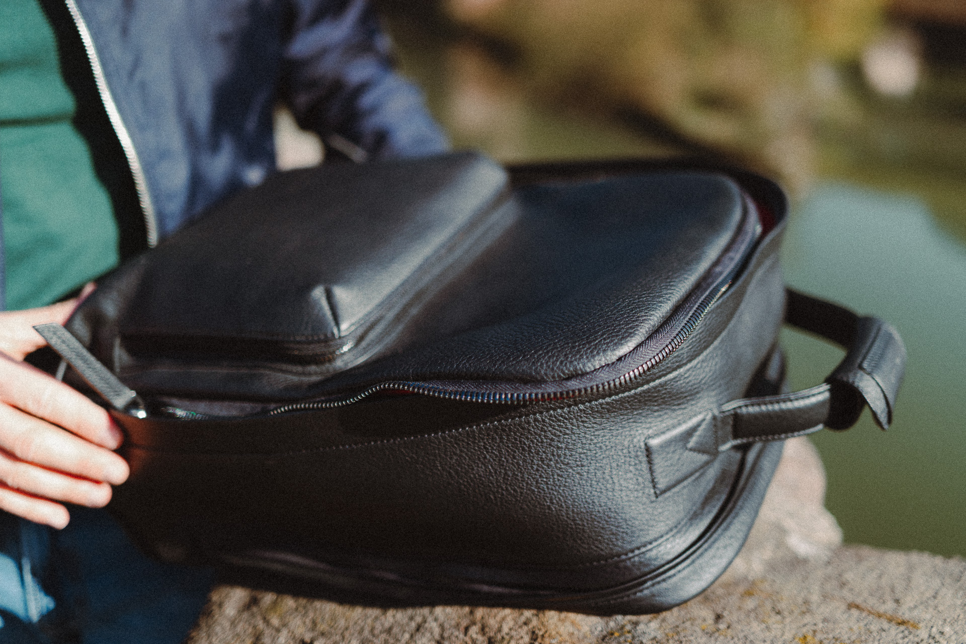 Das genarbte, schwarze Leder fühlt sich großartig an, und ich bin beeindruckt von der Verarbeitungsqualität. Jede Naht sitzt exakt, selbst die Trageriemen sind eine durchdachte Kombination aus Leder und Polsterung.